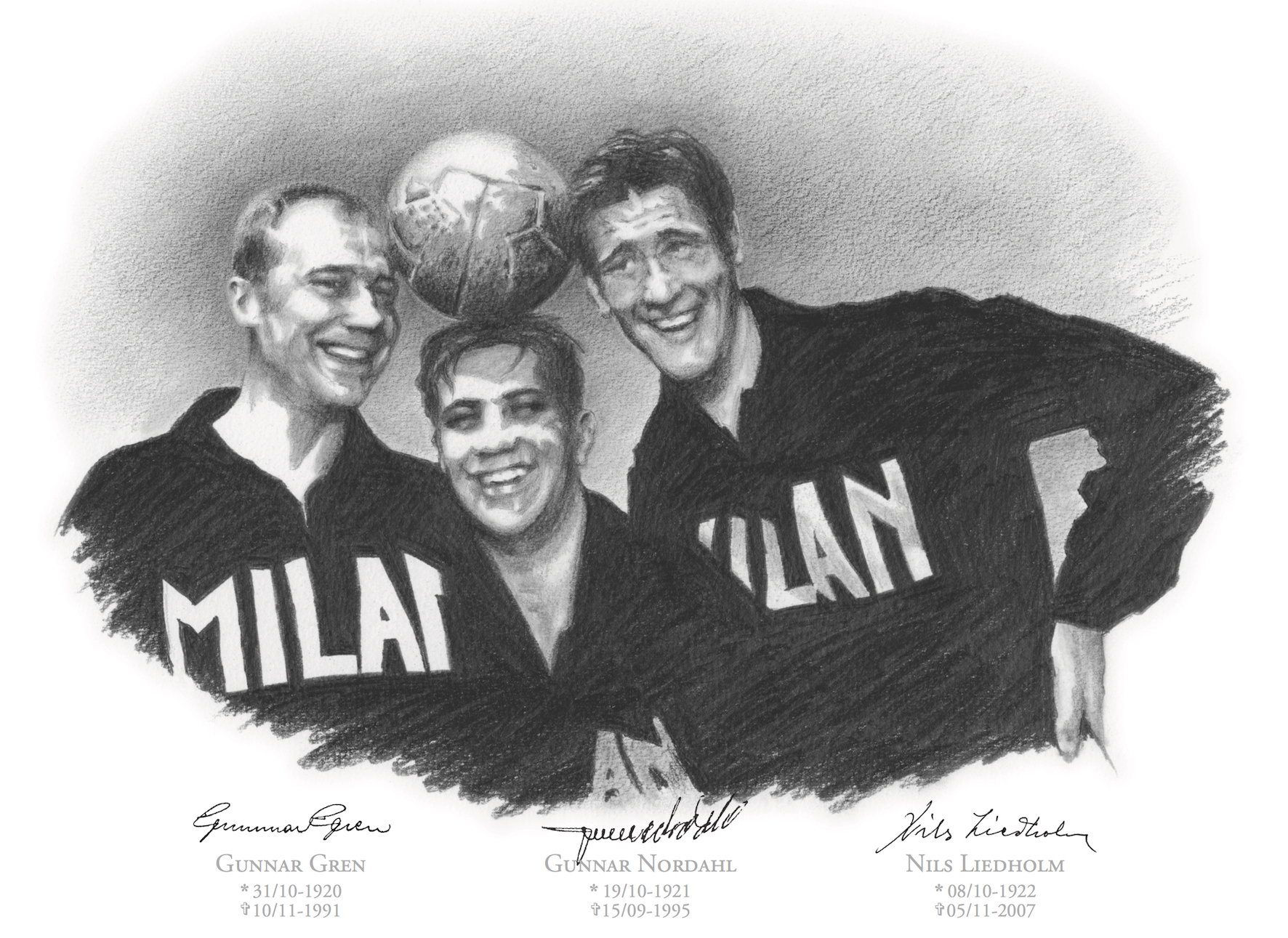 Litografi som föreställer 3 av Sveriges största Fotbollsspelare genom tiderna. Gunnar Gren, Gunnar Nordahl och Nils Liedholm.